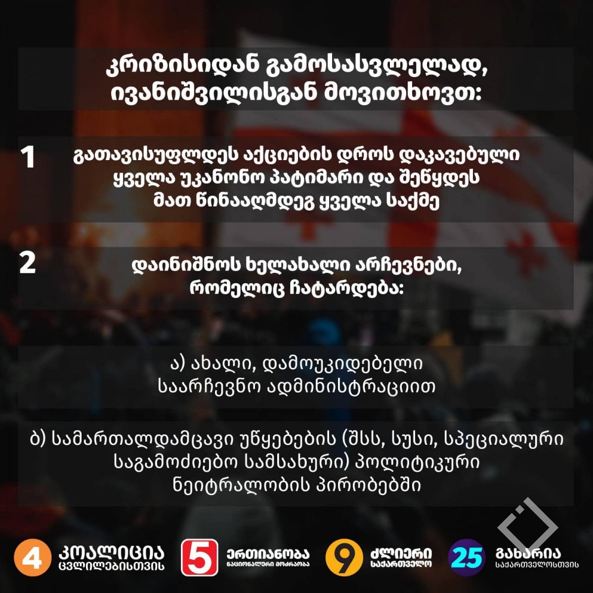კიდევ ერთხელ მკაფიოდ ვაფიქსირებთ იმ მოთხოვნებს ბიძინა ივანიშვილის მიმართ, რომელთა შესრულებაც აუცილებელია კრიზისიდან გამოსასვლელად: