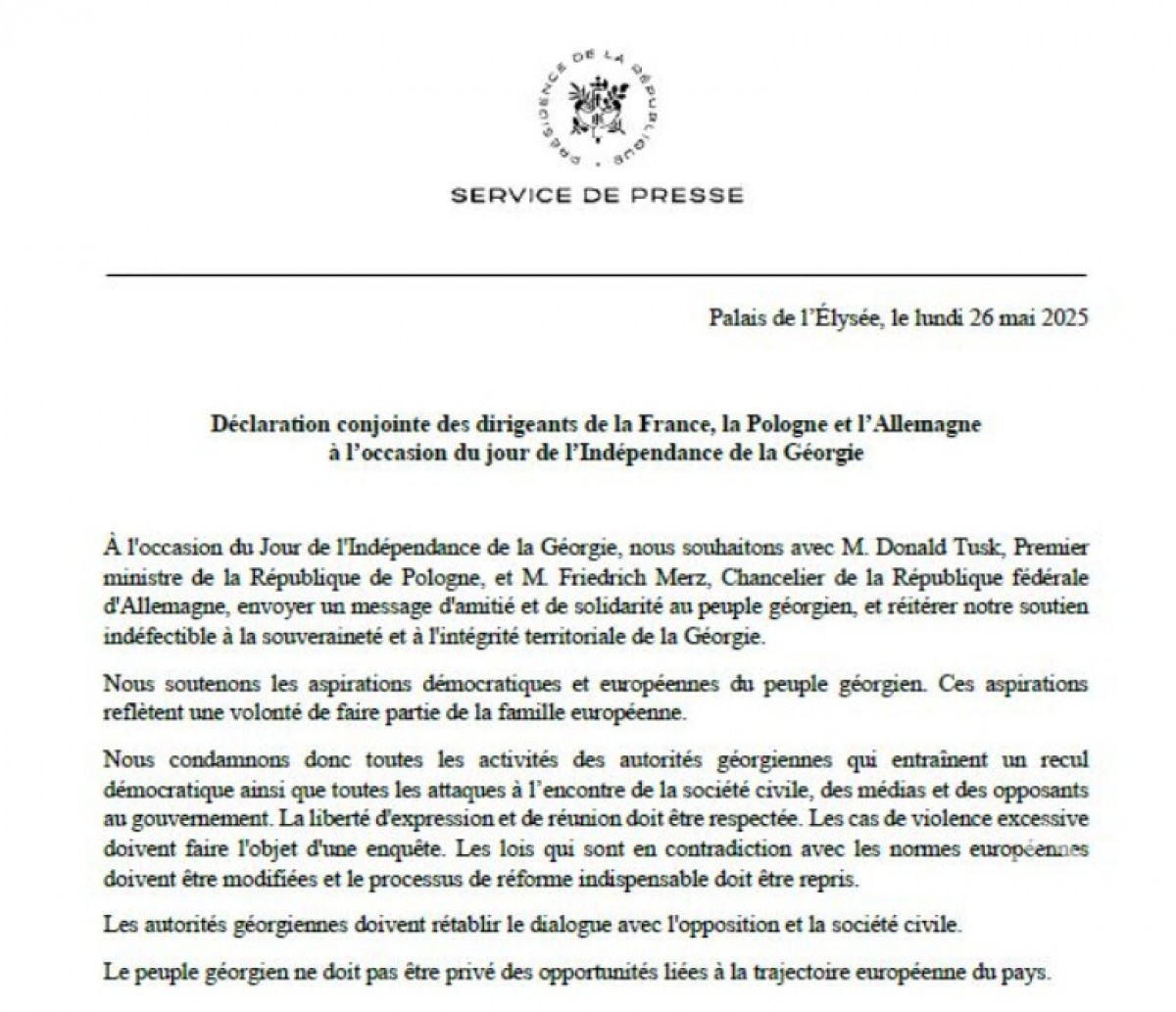 „საქართველოს დამოუკიდებლობის დღესთან დაკავშირებით, გვსურს, ბატონ დონალდ ტუსკთან, პოლონეთის რესპუბლიკის პრემიერ-მინისტრთან და ბატონ ფრიდრიხ მერცთან, გერმანიის ფედერაციული რესპუბლიკის კანცლერთან ერთად, ქართველ ხალხს მეგობრობისა და სოლიდარობის გზავნილი გავუგზავნოთ და კიდევ ერთხელ გავიმეორთ ჩვენი ურყევი მხარდაჭერა საქართველოს სუვერენიტეტისა და ტერიტორიული მთლიანობის მიმართ. ჩვენ მხარს ვუჭერთ ქართველი ხალხის დემოკრატიულ და ევროპულ მისწრაფებებს. ეს მისწრაფებები ასახავს ევროპული ოჯახის წევრობის სურვილს. შესაბამისად, ჩვენ ვგმობთ საქართველოს ხელისუფლების ყველა ქმედებას, რომელიც იწვევს დემოკრატიულ უკუსვლას, ისევე როგორც სამოქალაქო საზოგადოების, მედიისა და მთავრობის ოპონენტების წინააღმდეგ ყველა თავდასხმას. გამოხატვისა და შეკრების თავისუფლება უნდა იყოს დაცული. გადაჭარბებული ძალადობის შემთხვევები უნდა იქნეს გამოძიებული. კანონები, რომლებიც ეწინააღმდეგება ევროპულ ნორმებს, უნდა შეიცვალოს, ხოლო საჭირო რეფორმების პროცესი განახლდეს. საქართველოს ხელისუფლებამ უნდა აღადგინოს დიალოგი ოპოზიციასა და სამოქალაქო საზოგადოებასთან. ქართველ ხალხს არ უნდა წაერთვას ქვეყნის ევროპულ ტრაექტორიასთან დაკავშირებული შესაძლებლობები“, - ნათქვამია განცხადებაში.