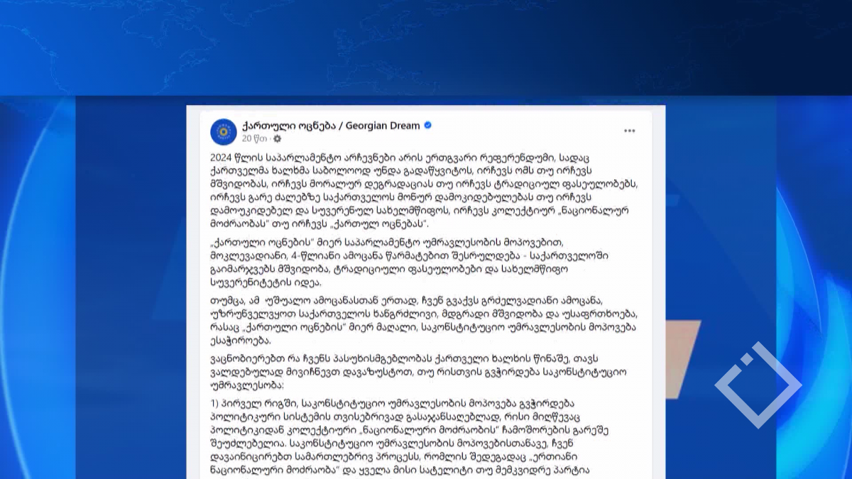 2024 წლის საპარლამენტო არჩევნები არის ერთგვარი რეფერენდუმი, სადაც ქართველმა ხალხმა საბოლოოდ უნდა გააკეთოს არჩევანი ომსა და მშვიდობას, მორალურ დეგრადაციასა და ...