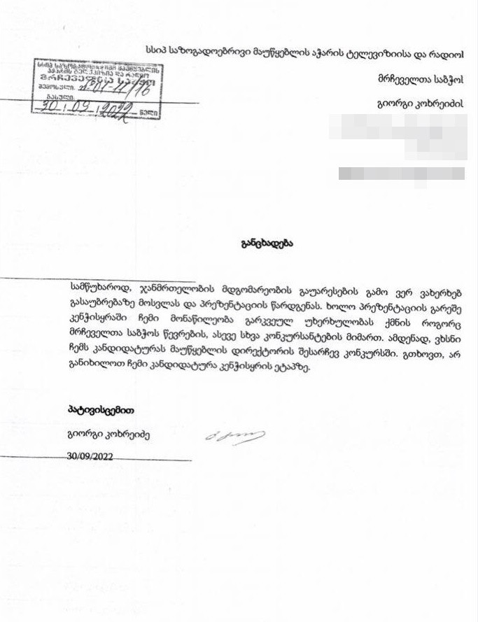 საზოგადოებრივი მაუწყებლის აჭარის ტელევიზიისა და რადიოს დირექტორის კონკურსს ერთი კანდიდატი გამოეთიშა.
