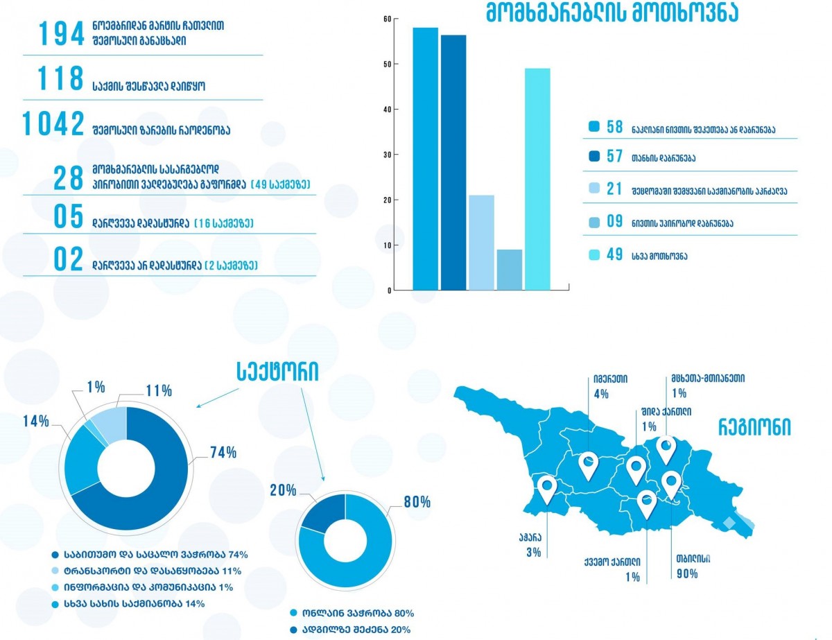 "ამავე პერიოდში, სააგენტოს გადაწყვეტილებით, დადასტურდა მომხმარებელთა ჯგუფის უფლების ხუთი დარღვევის ფაქტი – 16 საქმეზე, ხოლო ორ შემთხვევაში დარღვევა არ დადასტურდა.