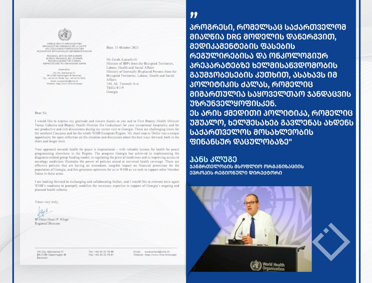 პროგრესი, რომელსაც საქართველომ მიაღწია დიაგნოზთან შეჭიდული ჯგუფებით (DRG) დაფინანსების მოდელის დანერგვით, მედიკამენტების ფასების რეგულირებისა და ონკოლოგიურ პრეპარატებზე ხელმისაწვდომობის გაუმჯობესების კუთხით, ასახავს იმ პოლიტიკის ძალას, რომელიც მიმართულია საყოველთაო ჯანდაცვის უზრუნველყოფისკენ, – აღნიშნულის შესახებ ჯანმრთელობის მსოფლიო ორგანიზაციის ევროპის რეგიონულმა დირექტორმა, ჰანს კლუგემ ჯანდაცვის მინისტრის, ზურაბ აზარაშვილისათვის გაგზავნილ წერილში აღნიშნა.