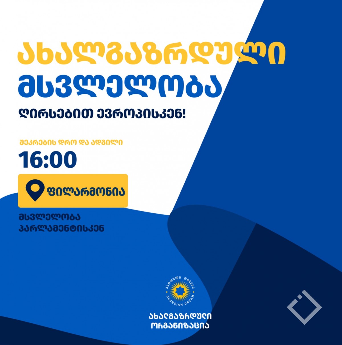 „ქართული ოცნების” ახალგაზრდული ორგანიზაცია საყოველთაო სახალხო შეკრებას უერთდება. ვიკრიბებით ფილარმონიასთან და 18:00 საათზე, მსვლელობით გადავინაცვლებთ პარლამენტის სასახლისკენ, სადაც მონაწილეობას მივიღებთ ღონისძიებაში - მამული, ენა, სარწმუნოება!