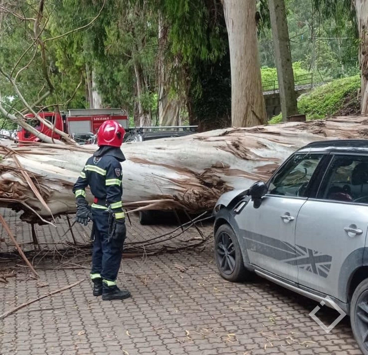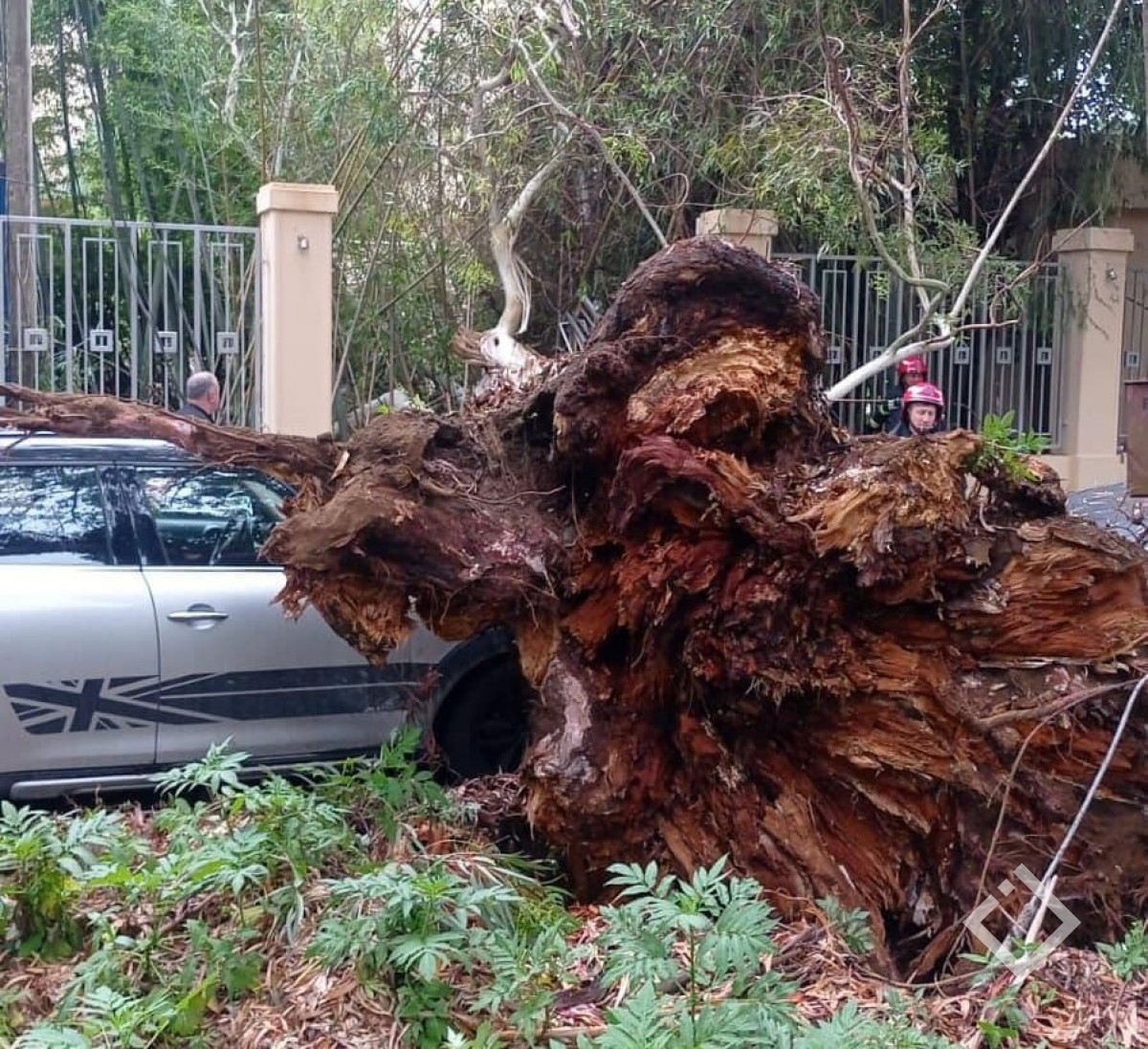 მოგლეჯილი ხე გზის სავალ ნაწილზე გაჩერებულ ავტომობილს დაეცა.