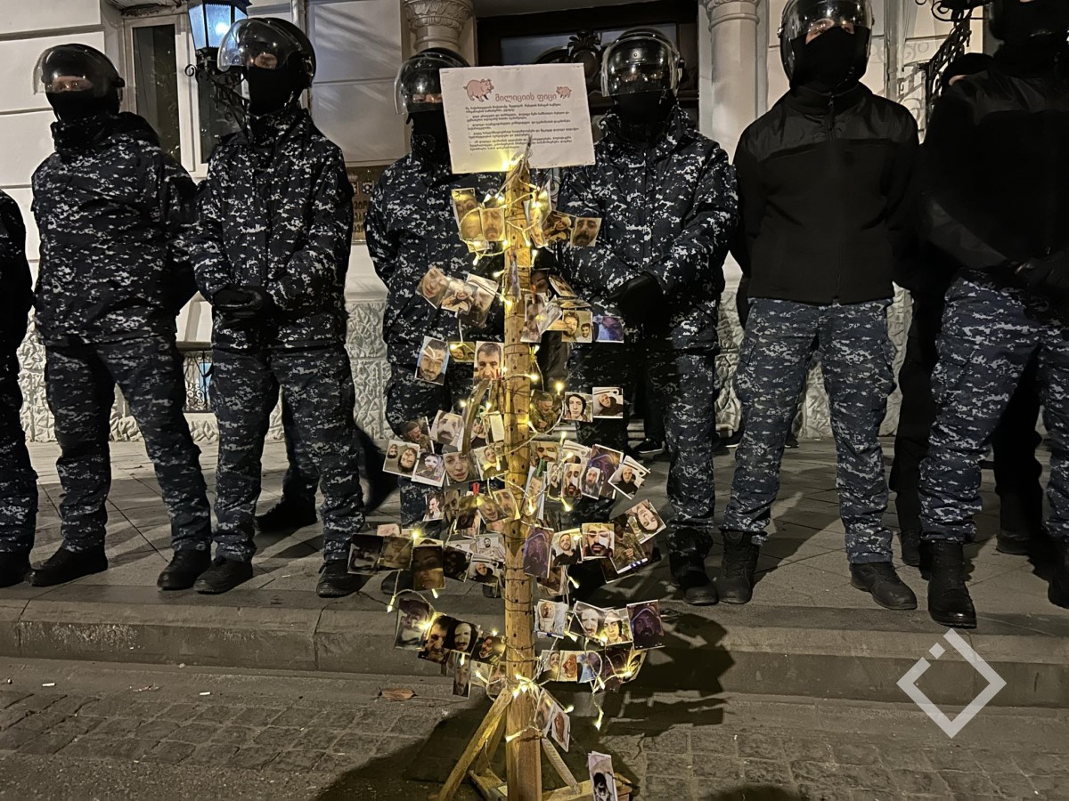 მომიტინგეებმა აქციაზე სიმბოლურად ნაძვის ხე დადგეს, რომელზეც პროტესტის დროს დაშავებულთა ფოტოები ჩამოკიდეს.