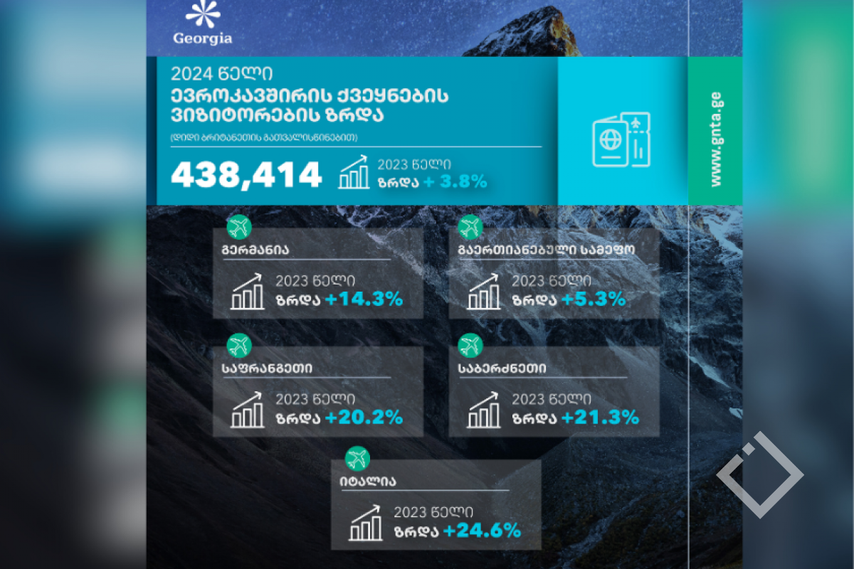 საქართველოში 2024 წელს ევროკავშირის ქვეყნებიდან და დიდი ბრიტანეთიდან 438,414 საერთაშორისო ვიზიტი შედგა, ზრდა 2023 წელთან შედარებით +3.8%-ია, – ამის შესახებ ინფორმაციას ტურიზმის ეროვნული ადმინისტრაცია ავრცელებს.