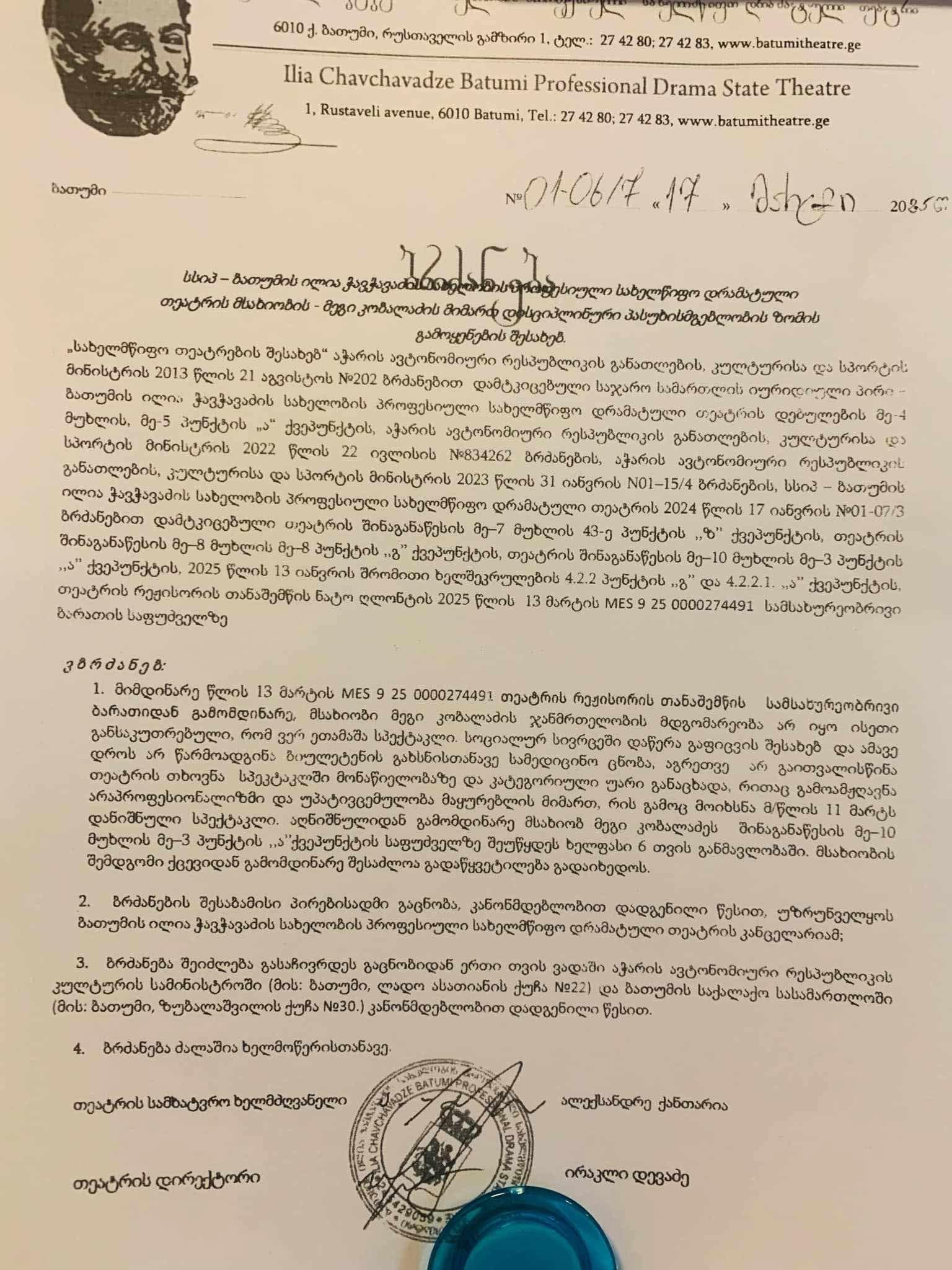 ბრძანებაში, რომელსაც მეგი კობალაძე თავად ავრცელებს, თეატრის ადმინისტრაცია განმარტავს, რომ თეატრის რეჟისორის თანაშემწის სამსახურეობრივი ბარათიდან გამომდინარე, მსახიობი მეგი კობალაძის ჯანმრთელობის მდგომარეობა არ იყო ისეთი განსაკუთრებული, რომ ვერ ეთამაშა სპექტაკლი. სოციალურ სივრცეში დაწერა გაფიცვის შესახებ და ამავე დროს არ წარმოადგინა ბიულეტენის გახსნისთანავე სამედიცინო ცნობა.