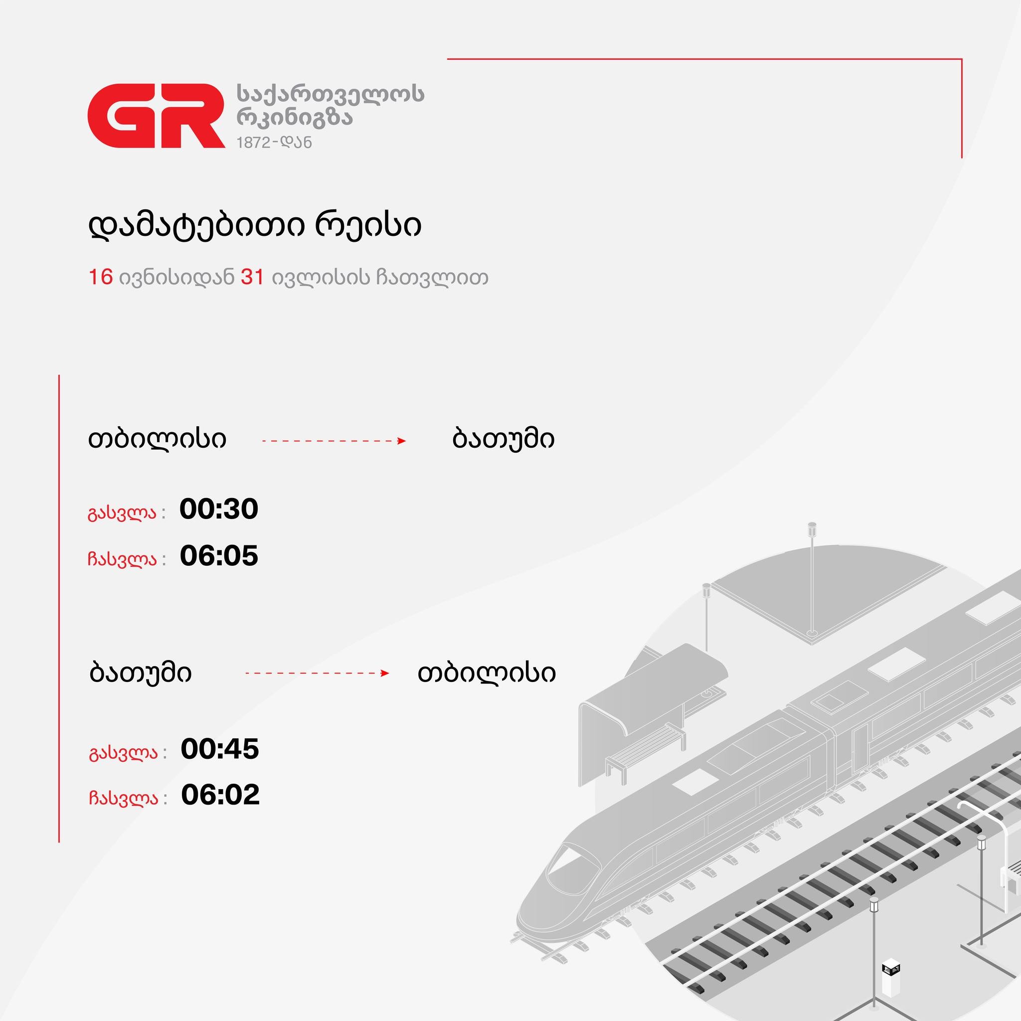 გაზრდილი მგზავრთნაკადის გამო, საქართველოს რკინიგზა 16 ივნისიდან 31 ივლისის  ჩათვლით,  თბილისი-ბათუმი-თბილისის მიმართულებით რეისებს ამატებს.