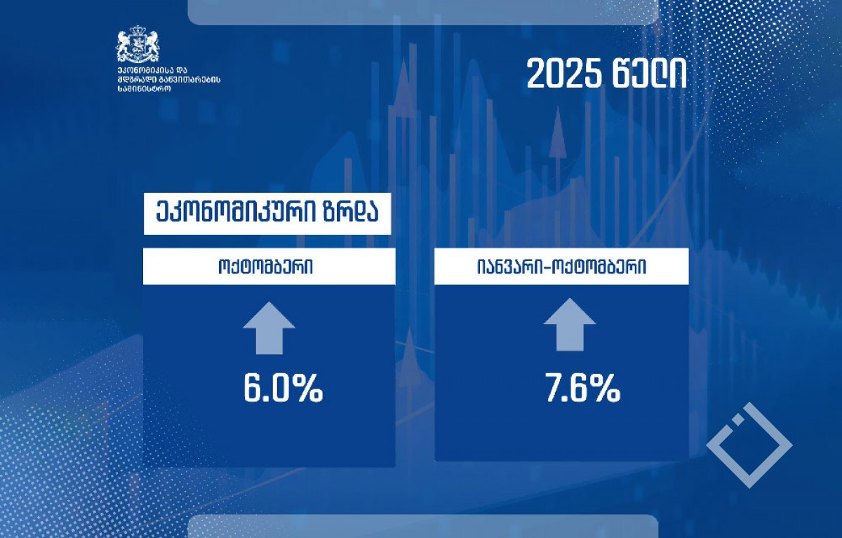 საქართველოს ეკონომიკის სამინისტროს ინფორმაციით, 2025 წლის ოქტომბერში საქართველოს ეკონომიკა 6.0%-ით გაიზარდა, ხოლო 2025 წლის იანვარი-ოქტომბრის საშუალო ეკონომიკური ზრდა 7.6%-ით განისაზღვრა.