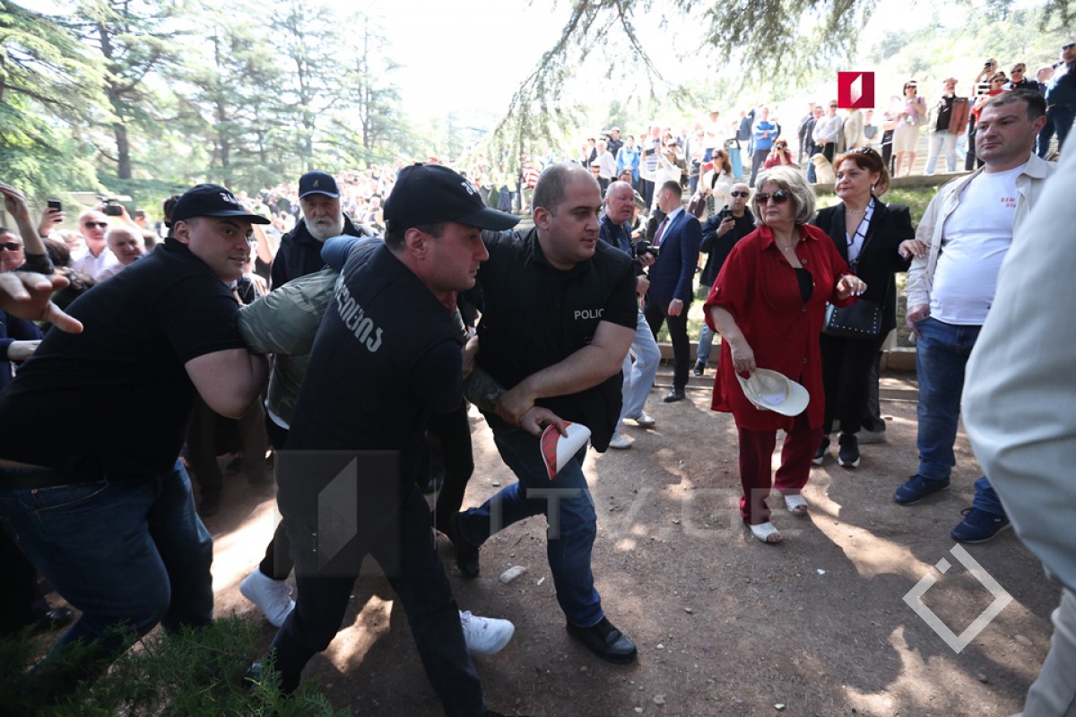 „შინაგან საქმეთა სამინისტროს თანამშრომლებმა ვაკის პარკში, 9 მაისისადმი მიძღვნილი ღონისძიებების კონტრაქციის წევრი, 1975 წელს დაბადებული კ.კ დააკავეს. აღნიშნული პირი შეეცადა განსხვავებული პოზიციის წარმომადგენლებისთვის დროშის ტარით მიეყენებინა დაზიანება, რა დროსაც პოლიციამ ის ადგილზე დააკავა. კ.კ დაკავებულია წვრილმანი ხულიგნობისა და პოლიციელის დაუმორჩილებლობის ფაქტზე ადმინისტრაციულ სამართალდარღვევათა კოდექსის 166-ე და 173-ე მუხლებით“, – აღნიშნულია უწყების ინფორმაციაში.