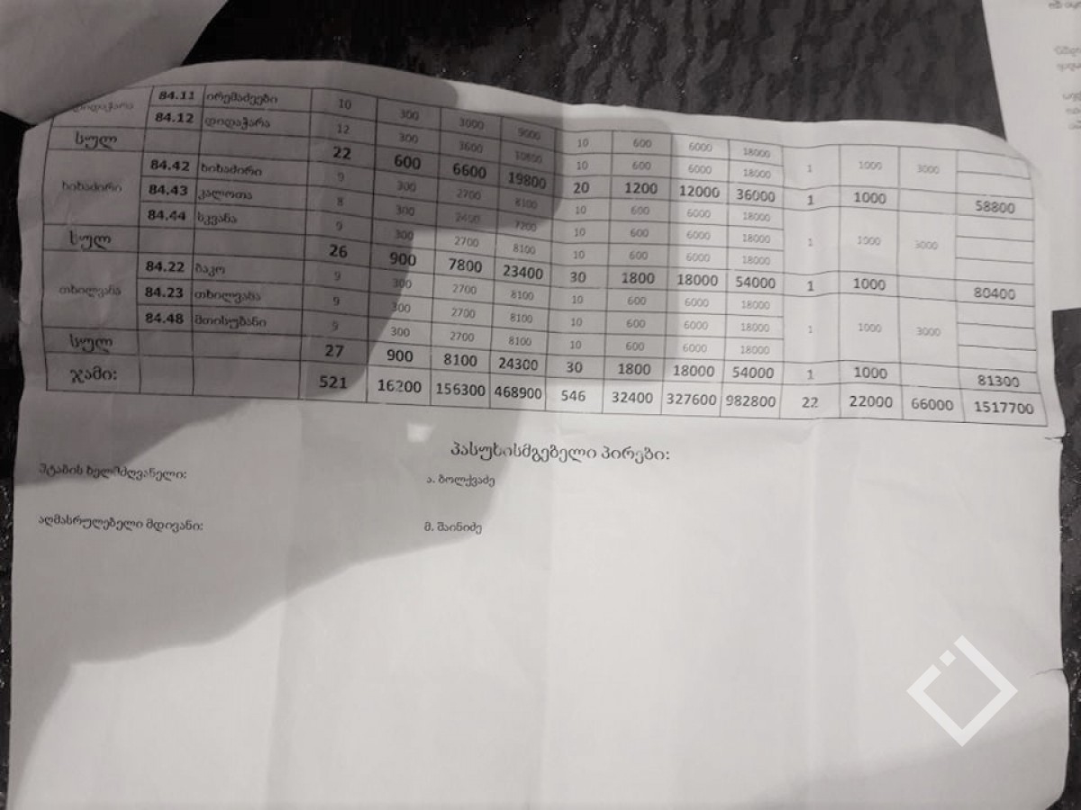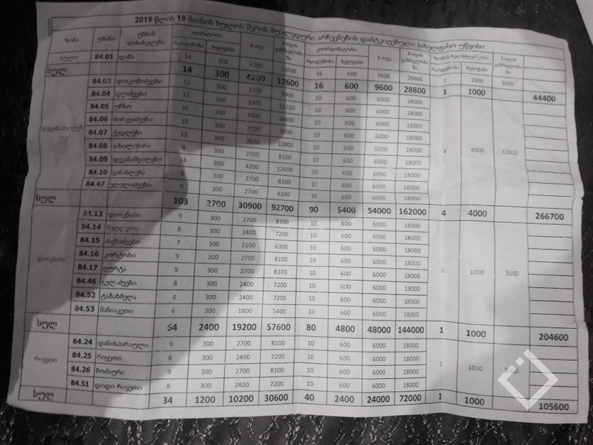"2019 წლის 19 მაისის ხულოს მერობის შუალედური არჩევნების დამტკიცებული სახელფასო უწყისი," - ასეა დასათაურებული დოკუმენტი. მასში წერია, რომ მაგალითად სოფელ დიაკონიძეებში "ქართულ ოცნებას" 11 აგიტატორი და 10 კოორდინატორი ჰყავს. აგიტატორების ხელფასი 300 ლარია, კოორდინატორების ექვსასი, ხოლო ზონის ერთი ხელმძღვანელის 1000 ლარი.