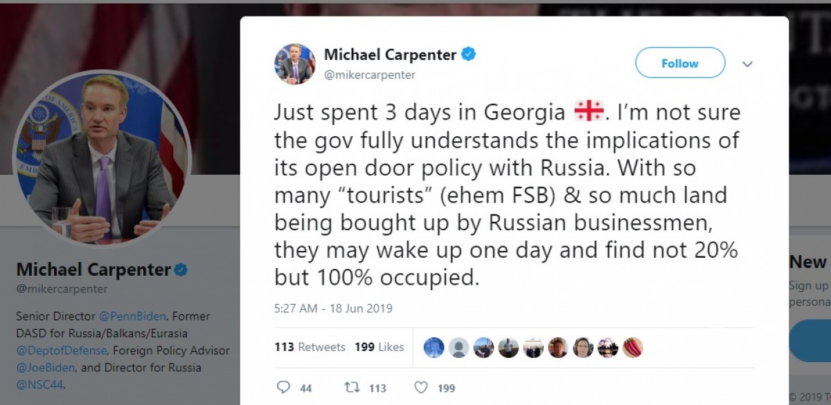 ამერიკის ატლანტიკური საბჭოს უფროსმა მკლევარმა, მაიკლ კარპენტერმა პოსტი ტვიტერზე საქართველოში სამდღიანი ვიზიტის შემდეგ დაწერა.