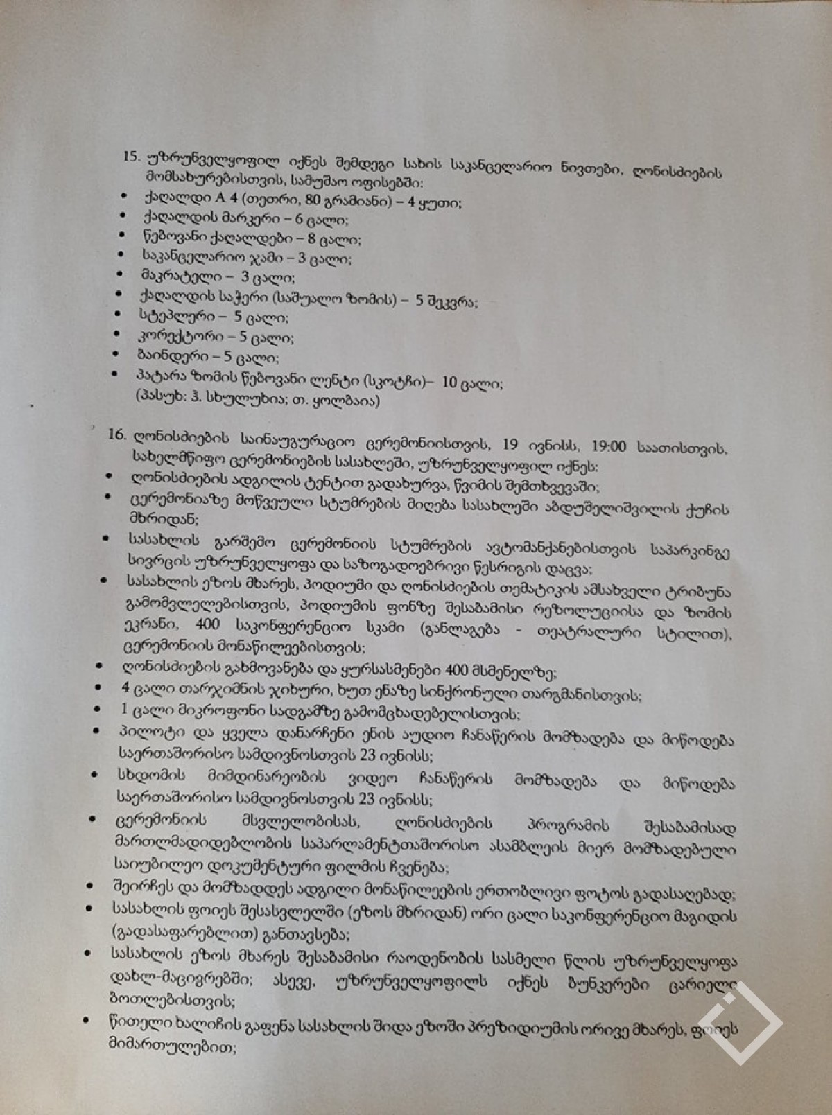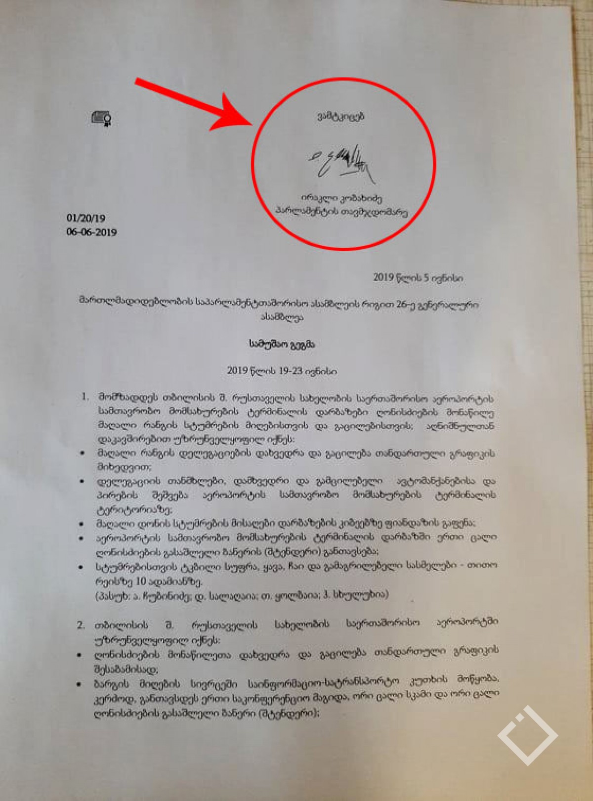 მართლმადიდებლური საპარლამენტთაშორისო ასამბლეის ორგანიზების დოკუმენტს ხელს ირაკლი კობახიძე აწერს. დოკუმენტში გაწერილია ასამბლეის ორგანიზების ყველა დეტალი, მათ შორი ბანერების ბეჭდვა, დელეგაციების აეროპორტში დახვედრა, სხვადასხვა რანგის შეხვედრები, ფურშეტები, ღვინის დეგუსტაცია რეგიონებში და ა.შ.
