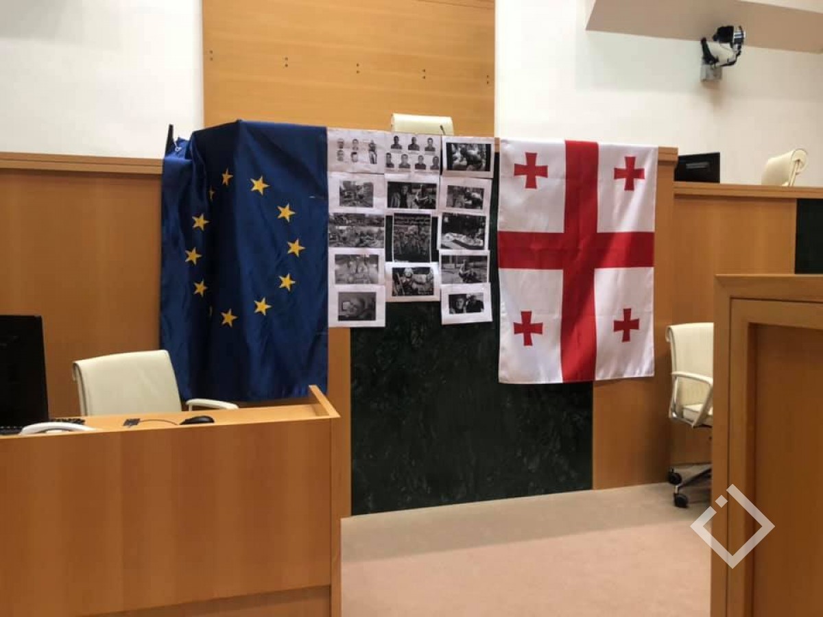 სხდომათა დარბაზში დროშები და იმ მეომრების სურათები გამოფინეს, რომლებიც რუსულ ოკუპაციას ემსხვერპლნენ