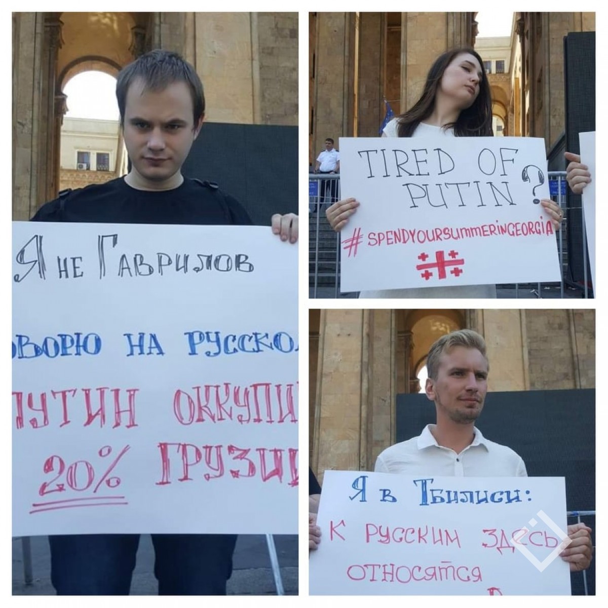 "დაიღალე პუტინით? გაატარე ზაფხული საქართველოში", რუსებს აქ უფრო კარგად ექცევიან ვიდრე რუსეთში'', ''ჩვენ არ ვართ გავრილოვები'', „დაიმახსოვრე კრემლო და პუტინო: – აფხაზეთი და სამაჩაბლო საქართველოა“, „პუტინს საქართველოს 20 პროცენტი აქვს ოკუპირებული“ - მსგავსი შინაარსი ტრანსფარანტებით მივიდნენ, უცხო ქვეყნის მოქალაქეები რუსთაველის გამზირზე.