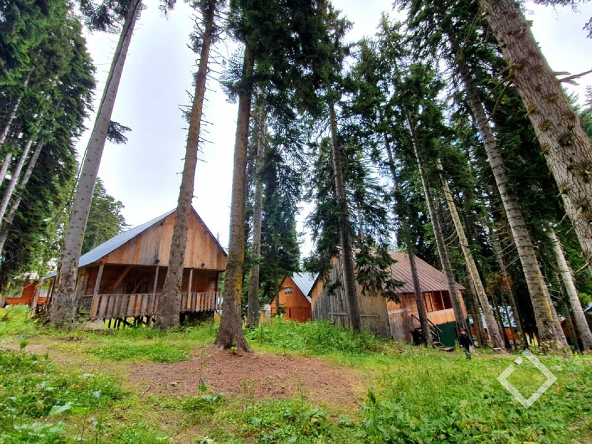 პატარა ხის კოტეჯები პირდაპირ ტყეში დგას...