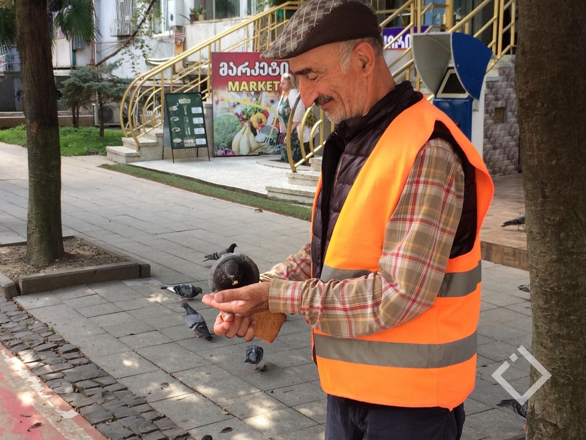 26 მაისის ქუჩაზე, სამშობიარო სახლის წინ, ამ სცენას ყოველდღე შეხვდებით. კაცი ავტოსადგომზე მორიგეობის პარალელურად მტრედებს აპურებს. ზოგიერთ ზედმეტად გათამამებულიც ჰყავს...