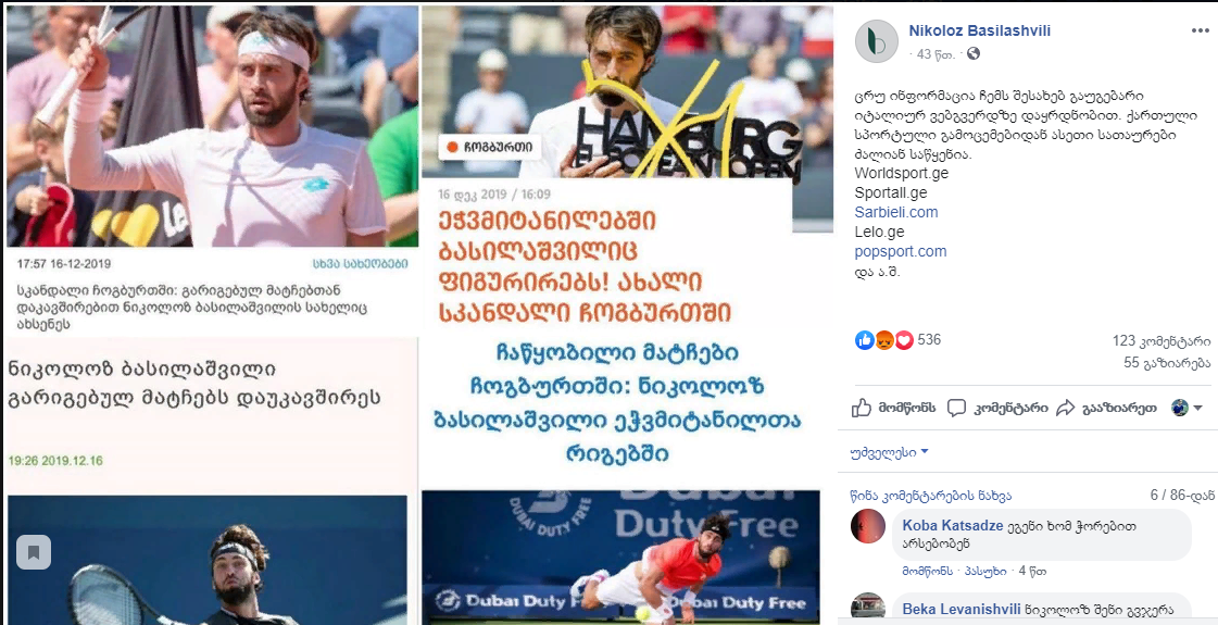 ქართველი ჩოგბურთელი ნიკოლოზ ბასილაშვილი უცხოურ და ქართულ პრესაში, საჩოგბურთო სკანდალთან დაკავშირებით გამოქვეყნებულ სტატიებს, სოციალურ ქსელის პირად გვერდზე ეხმაურება და აცხადებს, რომ მის შესახებ გავრცელებული ინფორმაცია სიცრუეა.