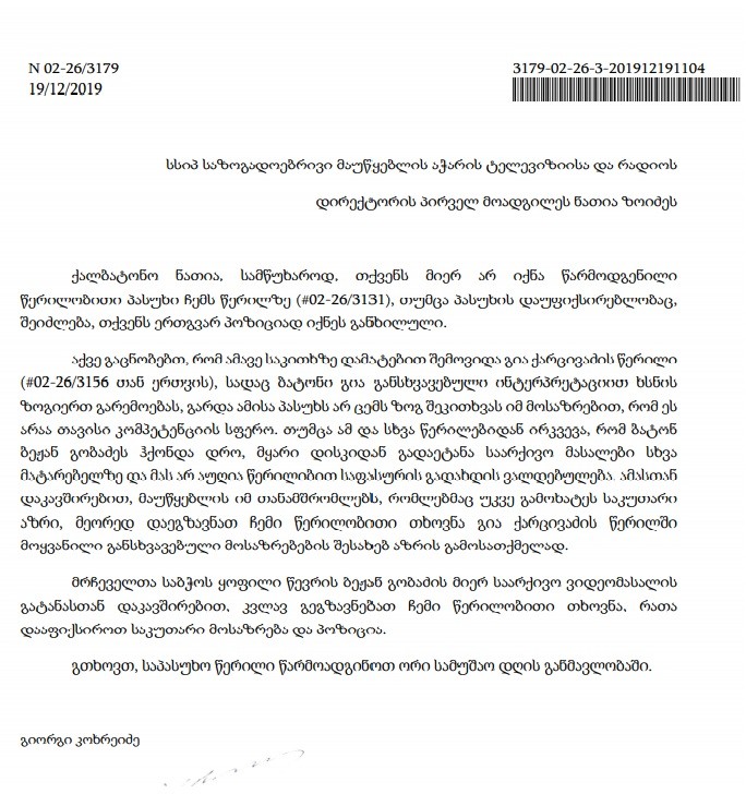 ამ ამბავში საინტერესო ის არის, რომ ბოლო ერთი თვის განმავლობაში, გიორგი კოხრეიძე ფაქტობრივად ორდღიანი შუალედით, ერთსა და იმავე კითხვაზე ითხოვს პასუხს 6 თანამშრომლისგან. მისი მოადგილის ნათია ზოიძისგან, საკადრო ბაზის განვითარების სამსახურის უფროსის გია ქაცივაძისგან, საქმის წარმოების განყოფილების უფროსის თეა შანიძისგან, სატელევიზო განვითარების სამსახურის უფროს ინგა გოგოლიშვილისგან, შიდა აუდიტის სამსახურის უფროს ზვიად ბერიძისგან და მთავარი იურისტისგან.