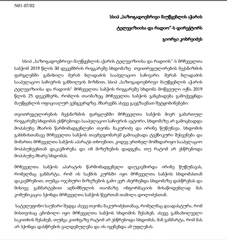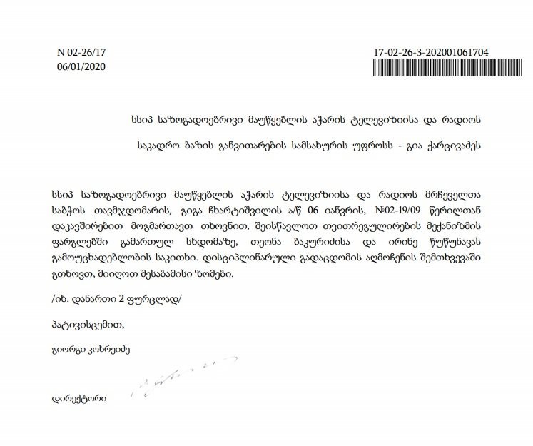 თავის მხრივ, გიორგი კოხრეიძე კი საკადრო ბაზის განვითარების უფროსს მიმართავს, რომ შეისწავლოს რატომ არ გამოცხადდნენ თეონა ბაკურიძე და ჟურნალისტი ირინე წუწუნავა სხდომაზე და დისციპლინარული გადაცდომის შემთხვევაში, შესაბამისი ზომები გაატაროს.