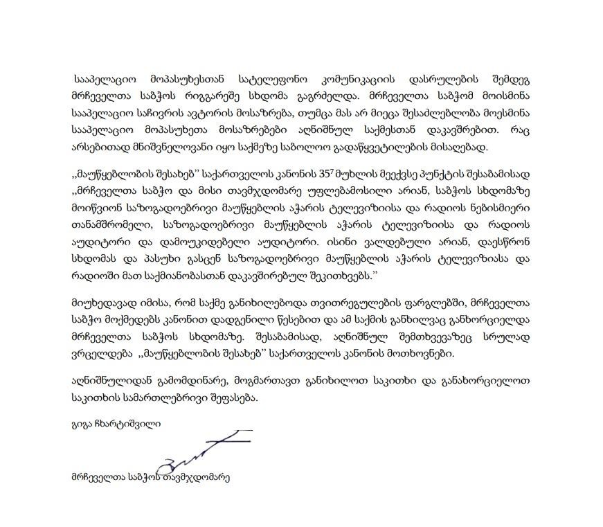 მრჩეველთა საბჭოს იურისტი მაუწყებელთან საუბარში ამბობს, რომ საბჭოს მიზანია დაადგინოს სამართლებრივად მაუწყებლის იურიდიულ სამსახურთან ერთად რამდენად არსებობს ასეთი ვალდებულება, რადგან ბორდის სხდომა თვითრეგულირების მექანიზმის ფარგლებში ჩაინიშნა. სურთ, რომ ეს პრეცედენტი დისკუსიის საგანი გახდეს და საბოლოოდ გაირკვეს, არის თუ არა ამის ვალდებულება.