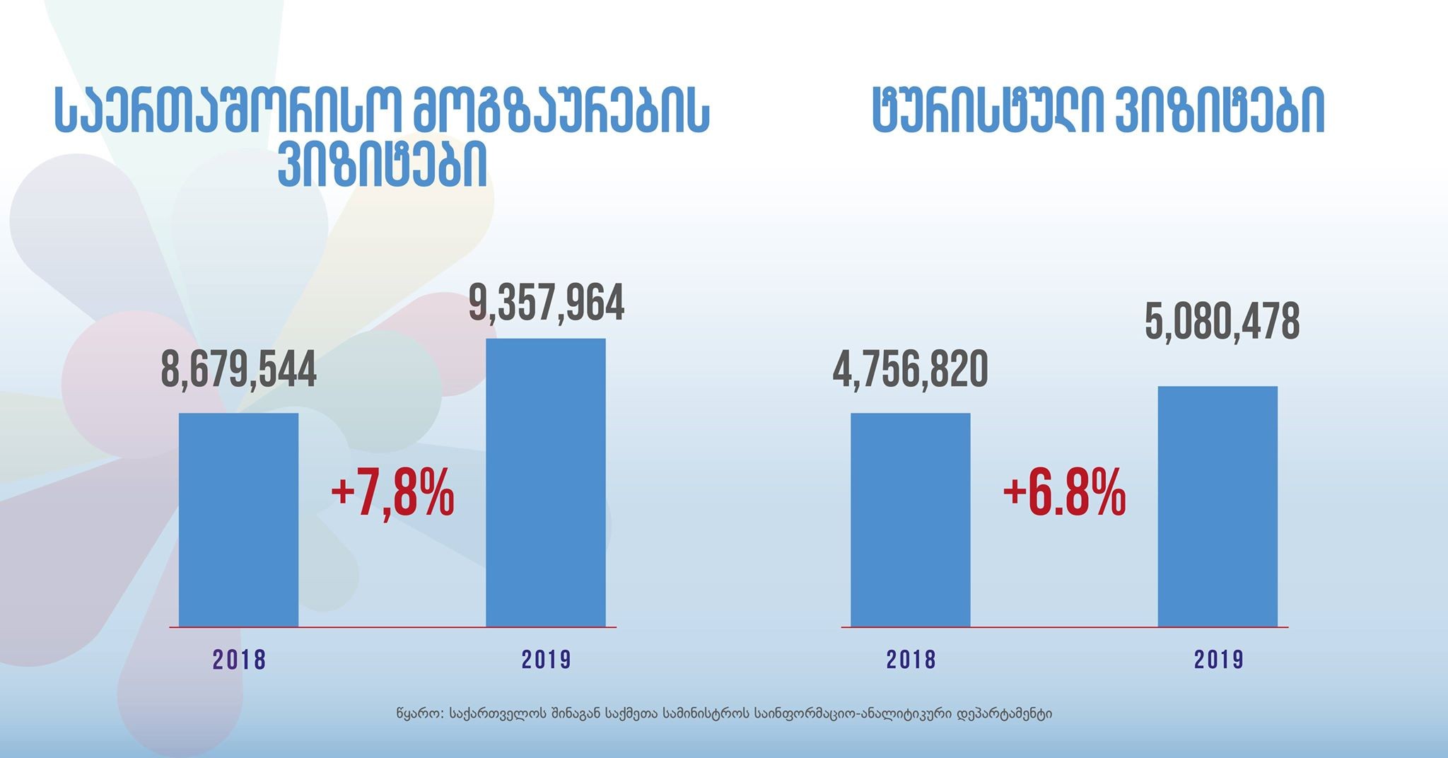 ტურიზმის ეროვნული ადმინისტრაციის ინფორმაციით, 2019 წელს საქართველომ საერთაშორისო მოგზაურისა და ტურისტების რეკორდულ რაოდენობას უმასპინძლა. ქვეყანაში 9,357,964 საერთაშორისო მოგზაურთა ვიზიტი დაფიქსირდა განსაკუთრებით ზრდა იყო, ევროკავშირის ქვეყნებიდან.