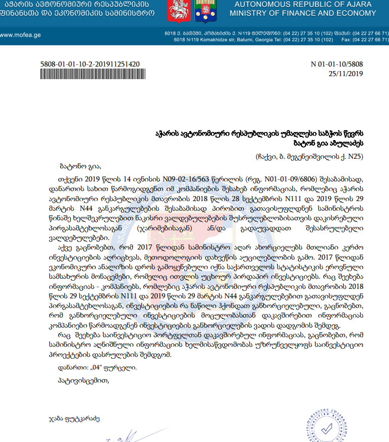 გია აბულაძემ დღეს ჟურნალისტებს ეკონომიკის სამინისტროსგან მიღებული წერილის ასლიც აჩვენა.