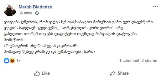 არ ცხოვრობ ისე,რომ ეგ მაკადროთ!!! მომავალ შეხვედრამდე და უნამუსოები ხართ" - წერს სოციალურ ქსელში დეპუტატი, რომელიც უმაღლეს საბჭოში "პატრიოტთა ალიანსის" კვოტით მოხვდა, თუმცა მან პარტია დატოვა და დამოუკიდებელი დეპუტატის სტატუსი აქვს.