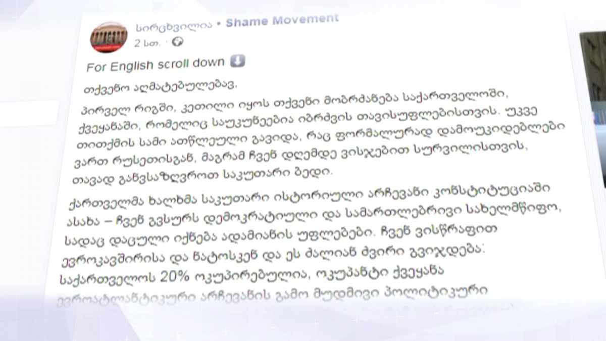 მოძრაობა "სირცხვილია" საქართველოში ამერიკის შეერთებული შტატების ახლადდანიშნულ ელჩს, კელი დეგნანს მიმართავს. მოძრაობის აქტივისტები დიპლომატს დახმარებას სთხოვენ. მათ მიერ გავრცელებულ განცხადებაში საუბარია ე.წ. გავრილოვის ღამეზე და ქვეყანაში ბოლო პერიოდის განმავლობაში განვითარებულ მოვლენებზე. "ქართველმა ხალხმა საკუთარი ისტორიული არჩევანი კონსტიტუციაში ასახა – ჩვენ გვსურს დემოკრატიული და სამართლებრივი სახელმწიფო, სადაც დაცული იქნება ადამიანის უფლებები. ჩვენ ვისწრაფით ევროკავშირისა და ნატოსკენ და ეს ძალიან ძვირი გვიჯდება: საქართველოს 20% ოკუპირებულია, ოკუპანტი ქვეყანა ევროატლანტიკური არჩევანის გამო მუდმივი პოლიტიკური დესტაბილიზაციით გვიხდის სამაგიეროს, მაგრამ საქართველოს სამოქალაქო საზოგადოება ბრძოლას მაინც აგრძელებს. პროპორციული არჩევნები ჩვენი აქციების 3 მოთხოვნიდან უმნიშვნელოვანესი იყო, რადგან არსებული შერეული სისტემა ვერ უზრუნველყოფს საზოგადოებრივი ჯგუფების სრულყოფილ რეპრეზენტაციას საკანონმდებლო ორგანოში.“ -აღნიშნულია განცხადებაში. "გვინდა გთხოვოთ, დაეხმაროთ საქართველოს სამოქალაქო საზოგადოებას, რათა ქვეყანამ მყარი ნაბიჯები გადადგას დასავლეთისკენ, დემოკრატიისკენ, თავისუფლებისკენ და ეკონომიკური აღმავლობისკენ, რისი მიღწევაც პოლიტიკური სტაბილურობის გარეშე შეუძლებელია. გთხოვთ, გამოიყენოთ თქვენს ხელთ არსებული ყველა მექანიზმი, რათა დაარწმუნოთ მმართველი პარტია, შეასრულოს საზოგადოების დაკვეთა და მიიღოს სამართლიანი საარჩევნო სისტემა", - ნათქვამია განცხადებაში.