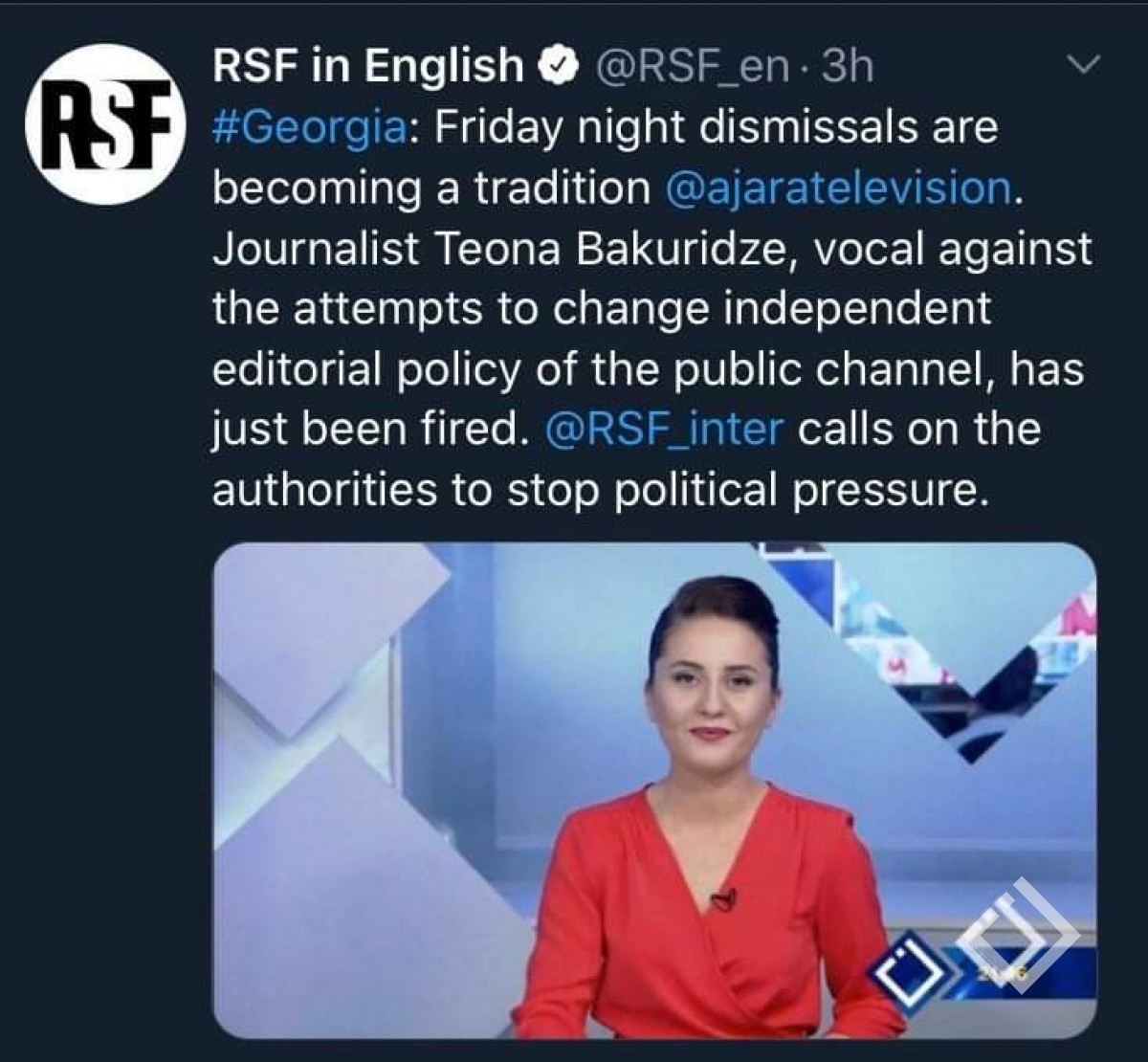 #Georgia: Friday night dismissals are becoming a tradition @ajaratelevision. Journalist Teona Bakuridze, vocal against the attempts to change independent editorial policy of the public channel, has just been fired. @RSF_inter calls on the authorities to stop political pressure. pic.twitter.com/Sd37xe7Abn