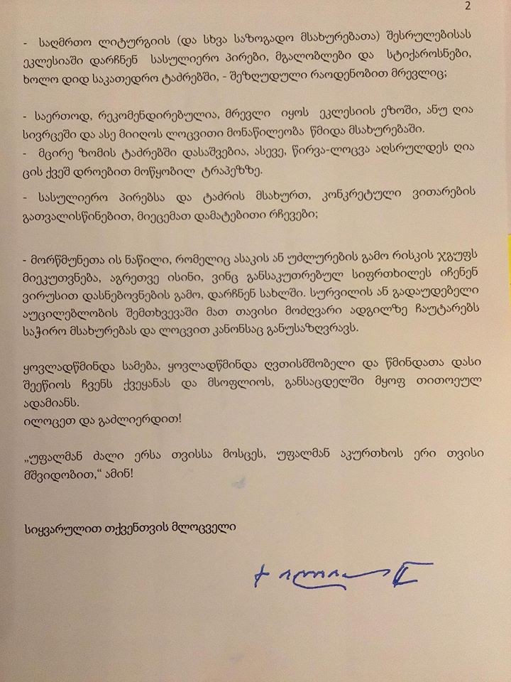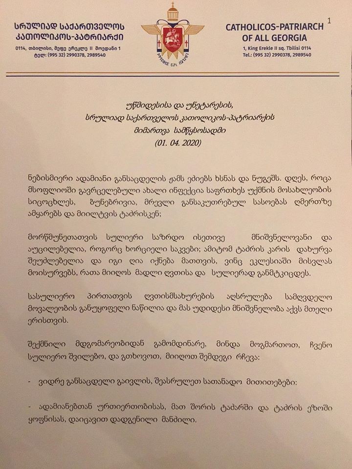 "ნებისმიერი ადამიანი განსაცდელის ჟამს ეძიებს ხსნას და ნუგეშს. დღეს, როცა მსოფლიოში გავრცელებული ახალი ინფექცია საფრთხეს უქმნის მოსახლეობის სიცოცხლეს, ბუნებრივია, მრევლი განსაკუთრებულ სასოებას ღმერთზე ამყარებს და მიილტვის ტაძრისკენ;