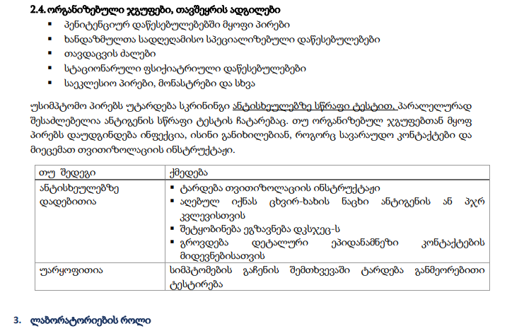 ჯგუფებს შორის, რომელთაც სწრაფი ტესტებით სკრინინგი უნდა ჩაუტარდეთ, დასახელებულნი არიან: პენიტენციურ დაწესებულებებში მყოფი პირები, თავდაცვის ძალები და საეკლესიო პირები, ხოლო თავშეყრის ადგილების ჩამონათვალი, სადაც სკრინინგი უნდა ჩატარდეს, ასეთია: მონასტრები, ხანდაზმულთა სადღეღამისო სპეციალიზებული დაწესებულებები და სტაციონარული ფსიქიატრიული დაწესებულებები.