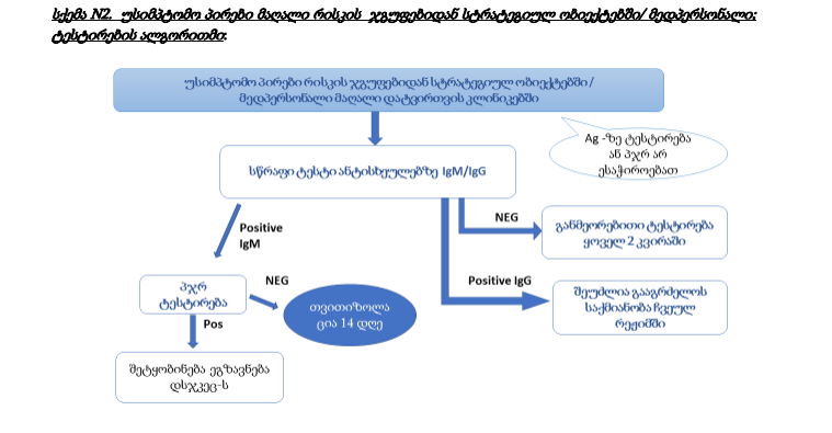 ამ ჯგუფში მყოფ უსიმპტომო პირებს უტარდებათ სკრინინგი ანტისხეულებზე სწრაფი ტესტით, პარალელურად შესაძლებელია ანტიგენის სწრაფი ტესტის ჩატარებაც. თუ ორგანიზებულ ჯგუფებთან მყოფ პირებს დაუდგინდება ინფექცია, ისინი განიხილებიან, როგორც სავარაუდო კონტაქტები და მიეცემათ თვითიზოლაციის ინსტრუქტაჟი.