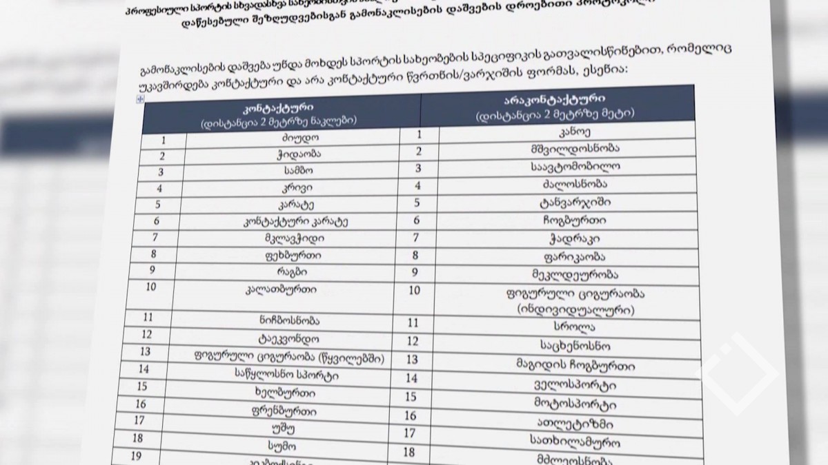 სპორტულმა ფედერაციებმა და ორგანიზაციებმა საწვრთნელი და საშეჯიბრო პროცესის ორგანიზებისას მკაცრად უნდა დაიცვან უსაფრთხოების ნორმები და იხელმძღვანელონ შემუშავებული რეკომედაციების მიხედვით, რომელიც ითვალისწინებს დეზინფექციის, სავალდებულო კარანტინის, ჰიგიენური ნორმების დაცვას. „ახალი კორონავირუსის პანდემიიდან გამომდინარე დაწესებული შეზღუდვებისგან გამონაკლისების დაშვების დროებითი პროტოკოლი“ შემუშავდა.