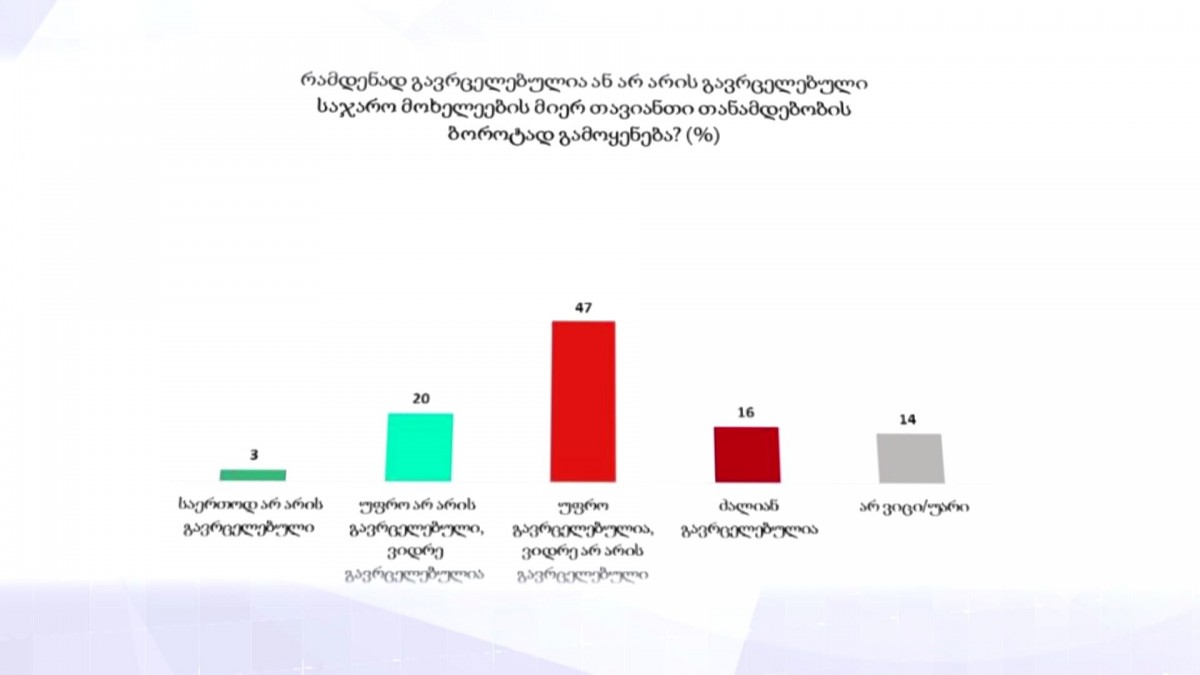 “საქართველოში კვლავ იშვიათია წვრილმანი კორუფცია, თუმცა გამოწვევად რჩება მისი კომპლექსური ფორმები და კორუფციის ისეთი შემთხვევების გამოძიება, სადაც მაღალი თანამდებობის პირები ფიგურირებენ” – საკითხზე საზოგადოების აზრი „საერთაშორისო გამჭვირვალობა-საქართველომ“ შეისწავლა. ირკვევა, რომ გამოკითხულთა მხოლოდ 1%-ს ჰქონია ბოლო 12 თვის განმავლობაში ისეთი შემთხვევა, როდესაც მათ ან მათი ოჯახის წევრებს სახელმწიფო მომსახურების სანაცვლოდ ქრთამის გადახდა მოსთხოვეს, რაც გასულ წლების მონაცემების იდენტური შედეგია. გამოკითხულთა 63% ფიქრობს, რომ ხშირია თანამდებობის პირების მიერ თანამდებობის ბოროტად გამოყენება.