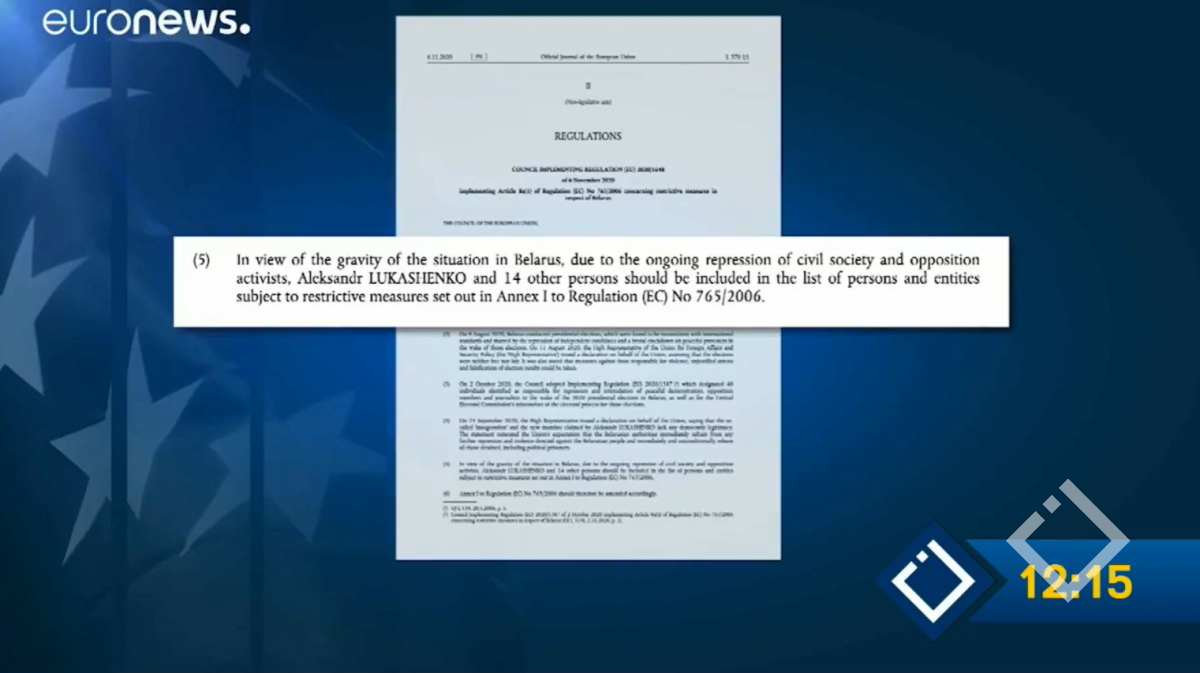 ევროკავშირმა პრეზიდენტ ალექსანდრე ლუკაშენკოსა და 14 ბელარუს მაღალჩინოსანს სანქციები დაუწესა - შესაბამისი დოკუმენტი ევროკავშირის ოფიციალურ ჟურნალში გამოქვეყნდა.