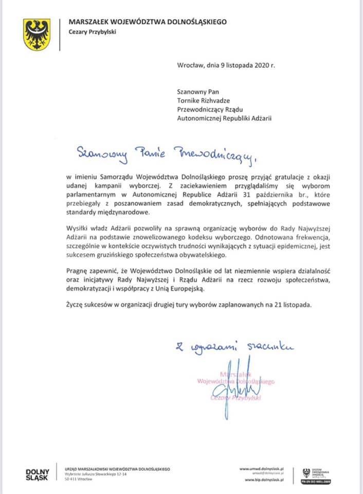 „ბატონო თავმჯდომარევ, ქვემო სილეზიის ხელისუფლების სახელით მინდა მოგილოცოთ წარმატებული საარჩევნო კამპანიის ჩატარება. დიდი ინტერესით ვადევნებდით თვალყურს საპარლამენტო არჩევნებს აჭარის ავტონომიურ რესპუბლიკაში, რომელიც 31 ოქტომბერს, საერთაშორისო სტანდარტების შესაბამისად, დემოკრატიული პრინციპების დაცვით გაიმართა. აჭარის ხელისუფლების ძალისხმევით, შესაძლებელი გახდა აჭარის უმაღლესი საბჭოს არჩევნების ეფექტურად გამართვა განახლებული საარჩევნო კანონმდებლობის საფუძველზე. დაფიქსირებული აქტიურობა, განსაკუთრებით ეპიდემიის შედეგად წარმოქმნილი აშკარა სირთულეების ფონზე, საქართველოს სამოქალაქო საზოგადოების დიდი წარმატებაა. გარწმუნებთ, რომ უკვე მრავალი წელია ქვემო სილეზია მხარს უჭერს აჭარის უმაღლესი საბჭოსა და მთავრობის საქმიანობას, საზოგადოების განვითარების, დემოკრატიის განმტკიცებისა და ევროკავშირთან თანამშრომლობის მიმართულებით. წარმატებას გისურვებთ 21 ნოემბერს დაგეგმილი არჩევნების მეორე ტურის გამართვაში“ - ნათქვამია ქვემო სილეზიის სავოევოდოს მარშალის ცეზარი პშიბილსკის მიერ გამოგზავნილ ოფიციალურ წერილში.