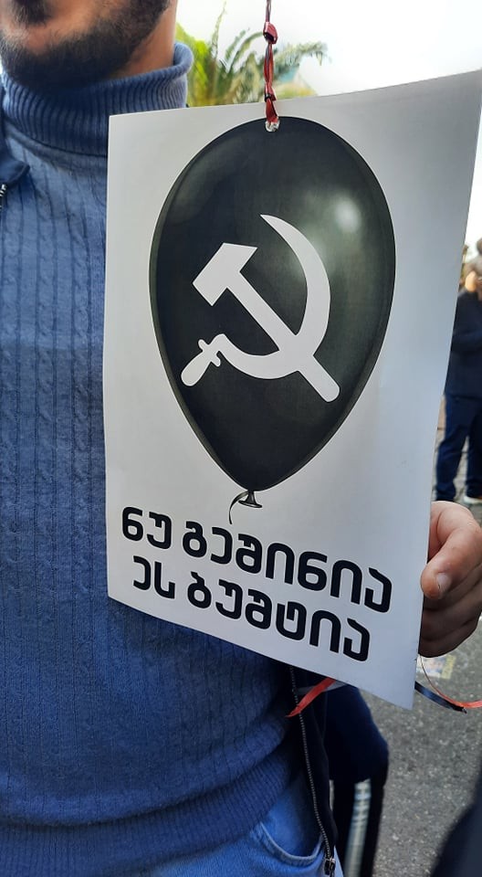 აქციაზე პლაკატებიც მიიტანეს, რომელზეც შავი ბუშტი, ასევე ნამგალი და უროა გამოსახული და აქვს წარწერა: ''ნუ გეშინია ეს ბუშტია''.