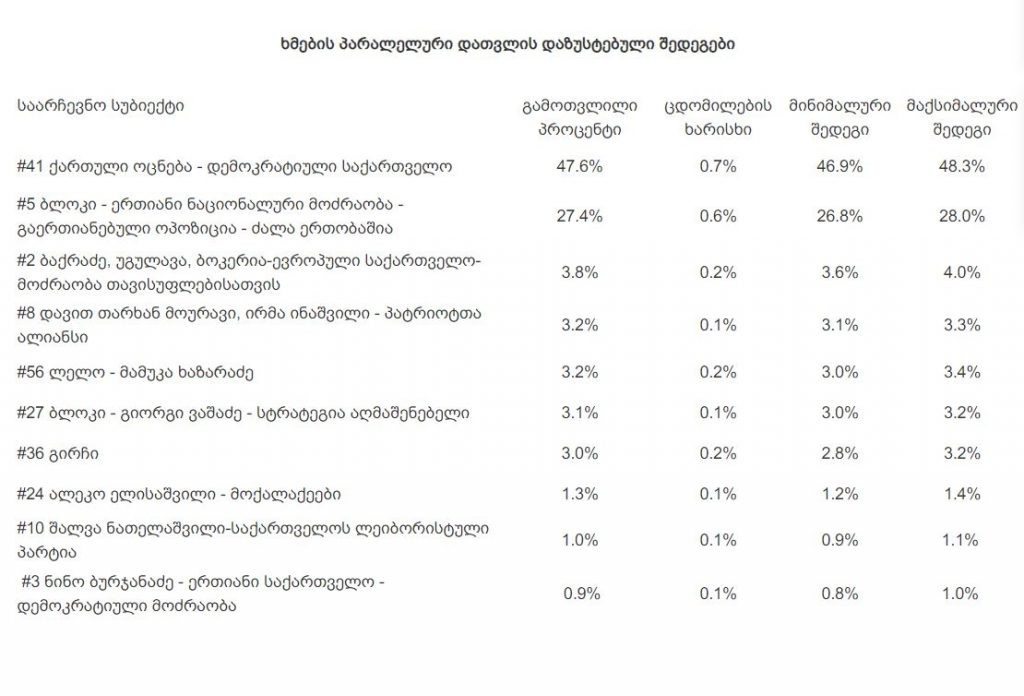 "სამართლიანი არჩევნების“ მიერ გამოქვეყნებულ ხმების პარალელური დათვლის დაზუსტებული შედეგები ასეთია: