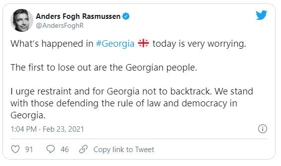 NATO-ს ყოფილი გენერალური მდივანი და დანიის ყოფილი პრემიერ-მინისტრი ანდრეს ფოგ რასმუსენი დღეს "ერთიანი ნაციონალური მოძრაობის" ოფისში საპოლიციო ძალების შეჭრას და პარტიის თავმჯდომარის ნიკა მელიას დაკავებას გამოეხმაურა.