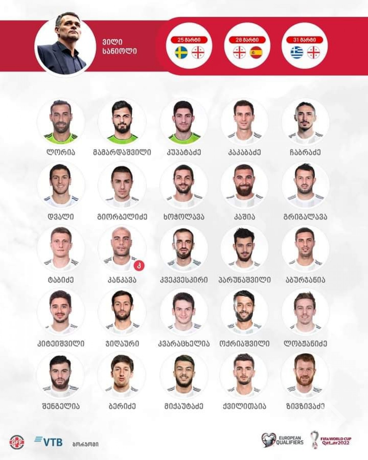 შვედეთის შემდეგ საქართველოს ნაკრები თბილისში, 28 მარტს ესპანეთის ნაკრებს უმასპინძლებს, საკვალიფიკაციო ეტაპის მესამე ტურში, 31 მარტს ჩვენი გუნდი სტუმრად საბერძნეთს დაუპირისპირდება. მიმდინარე თვეში დაგეგმილი მატჩებისთვის მოსამზადებლად საქართველოს ნაკრები 22 მარტიდან თბილისში შეიკრიბება. ვილი სანიოლმა საკვალიფიკაციო ეტაპის სამ ოფიციალურ შეხვედრაში მონაწილეობის მისაღებად 25 ფეხბურთელი გამოიძახა.