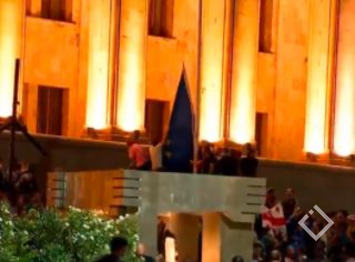 "თბილისი პრაიდის" მოწინააღმდეგეებმა პარლამენტის შენობასთან ევროკავშირის დროშა ჩამოხსნეს, დაწვეს და მის ნაცვლად საქართველოს დროშა აღმართეს.