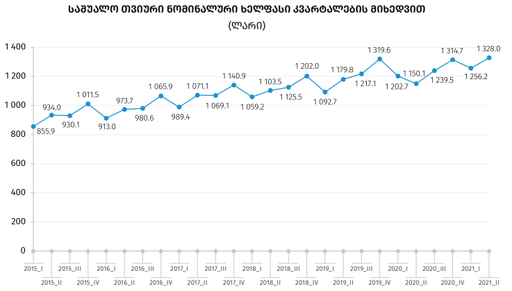 საქართველოს სტატისტიკის ეროვნული სამსახურის ინფორმაციით, 2021 წლის II კვარტალში საქართველოში საშუალო თვიური ნომინალური ხელფასი გასული წლის შესაბამის პერიოდთან შედარებით 15.5 პროცენტით (177.9 ლარით) გაიზარდა და 1 328.0 ლარი შეადგინა.