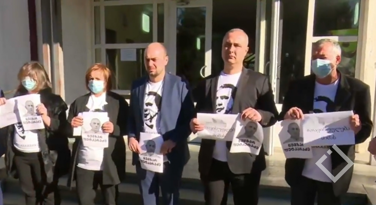 ოპოზიციონერმა დეპუტატებმა საკრებულოს შენობასთან აქცია-პერფორმანსი გამართეს, გარდაცვლილი დეპუტატის ნუგზარ ფუტკარაძის ფოტოები და წარწერები მიიტანეს - "თავისუფლება მიშას".