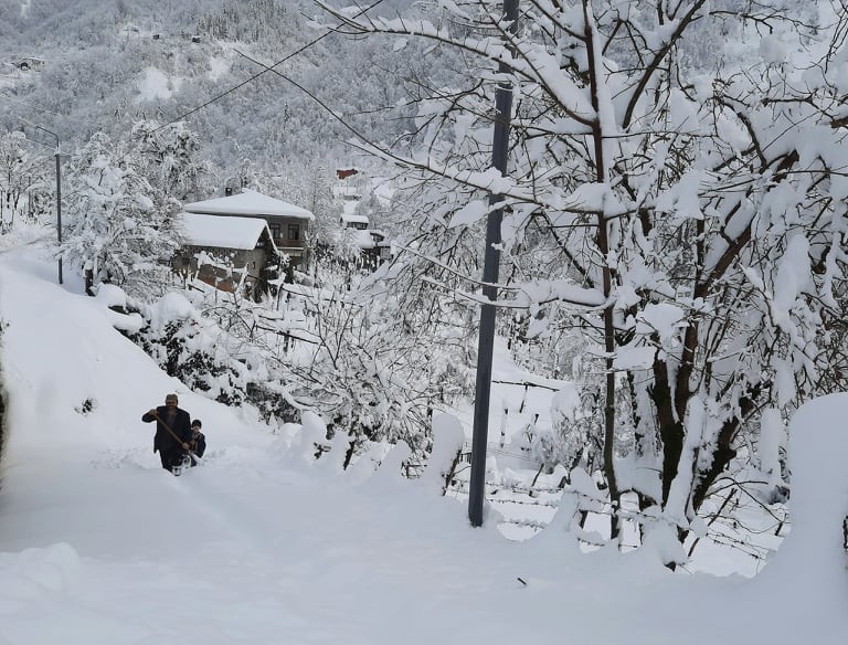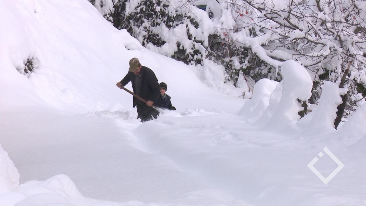 დათოვლილ გზას მამა-შვილი ერთად წმენდს.