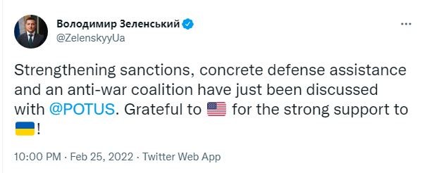 მადლობელი ვართ აშშ-ის ძლიერი მხარდაჭერისთვის უკრაინის მიმართ“,- დაწერა ვოლოდიმირ ზელენსკიმ „ტვიტერში“.