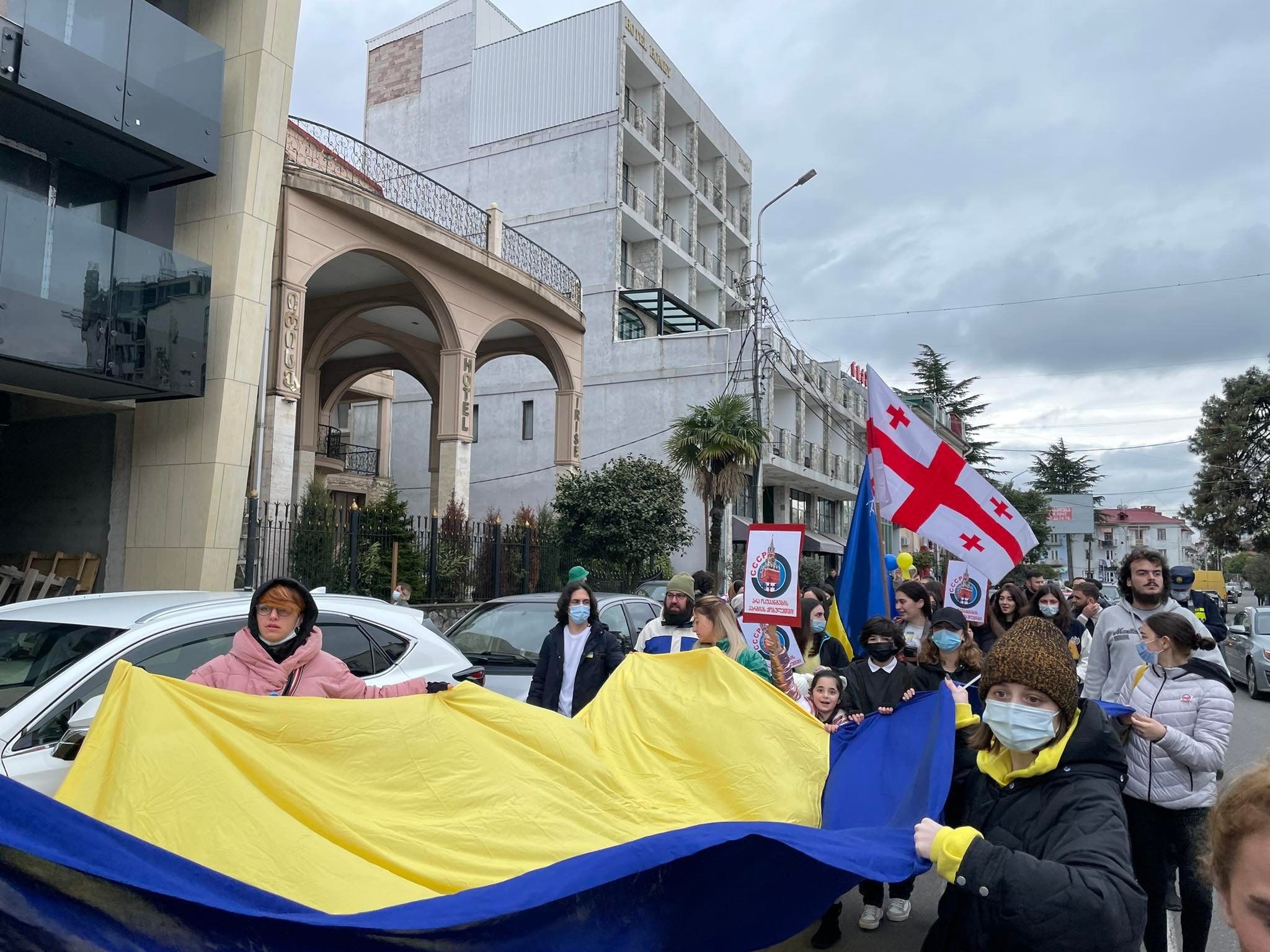 აქციაზე აქტივისტები, უკრაინის და საქართველოს სახელმწიფო დროშებით მივიდნენ.