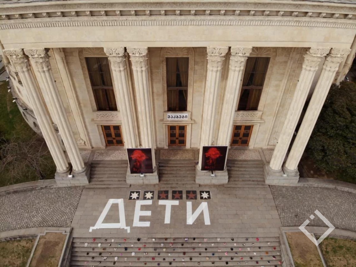 ასევე თეატრის წინ არის წარწერა “дети”, როგორც ეს მარიუპოლის თეატრთან იყო.